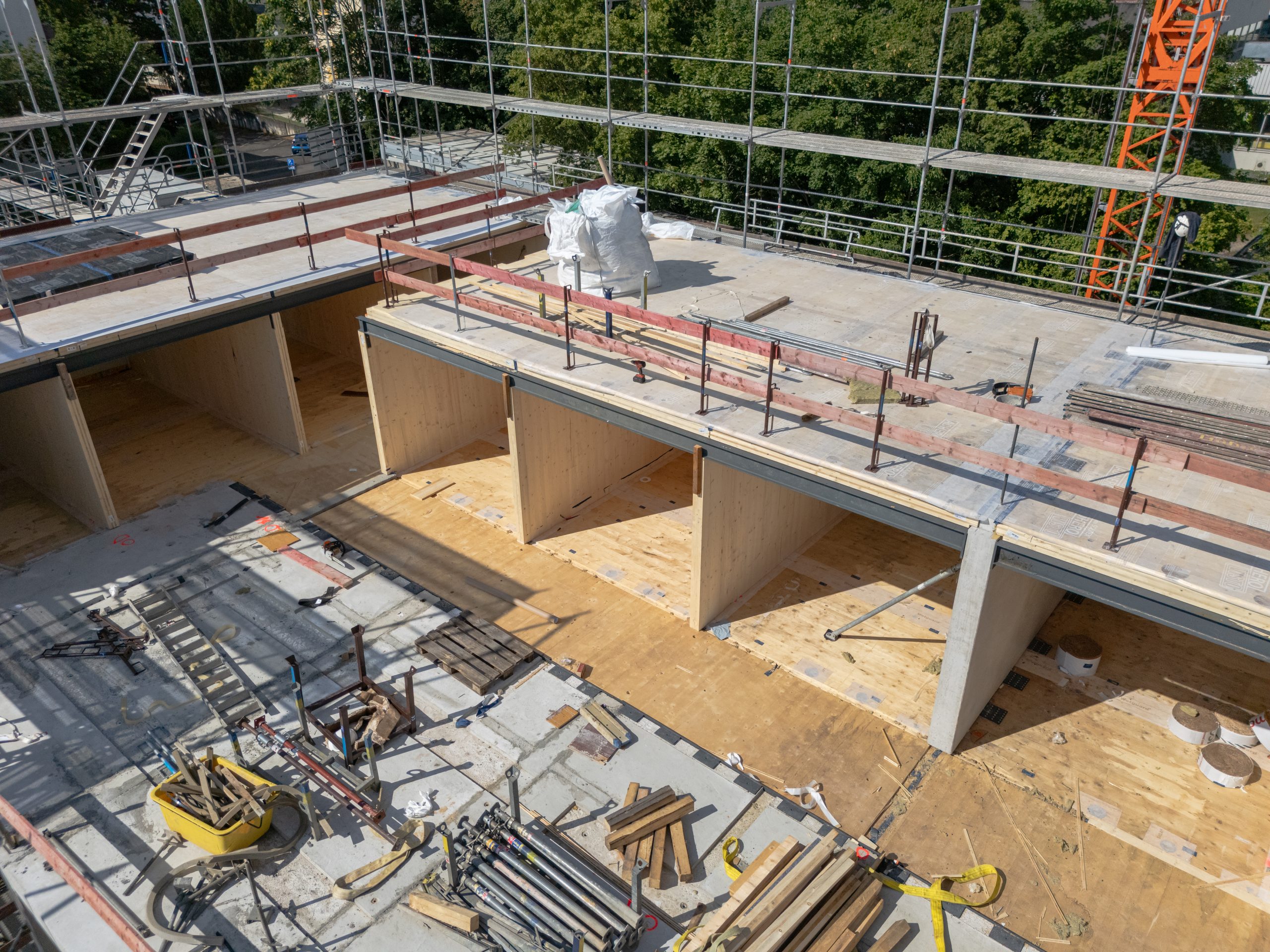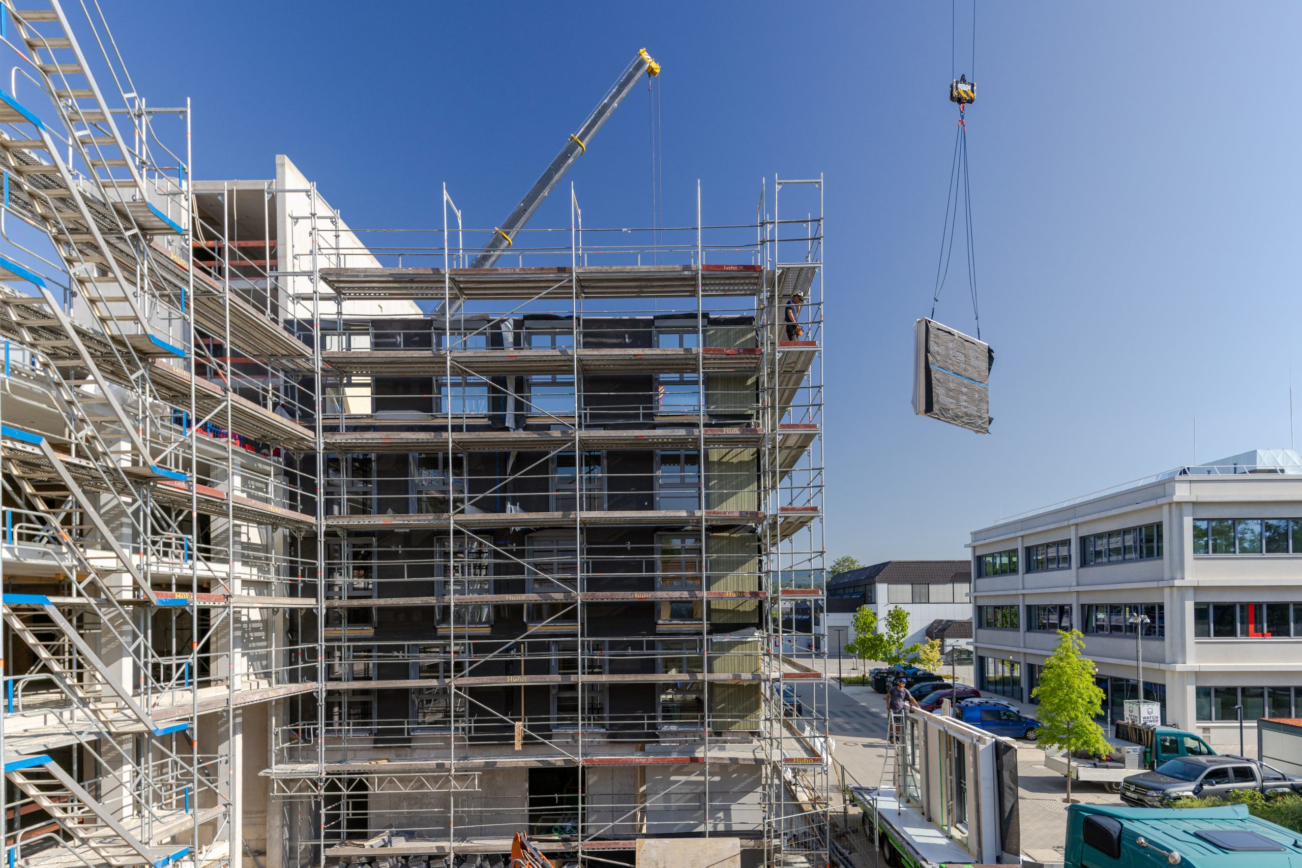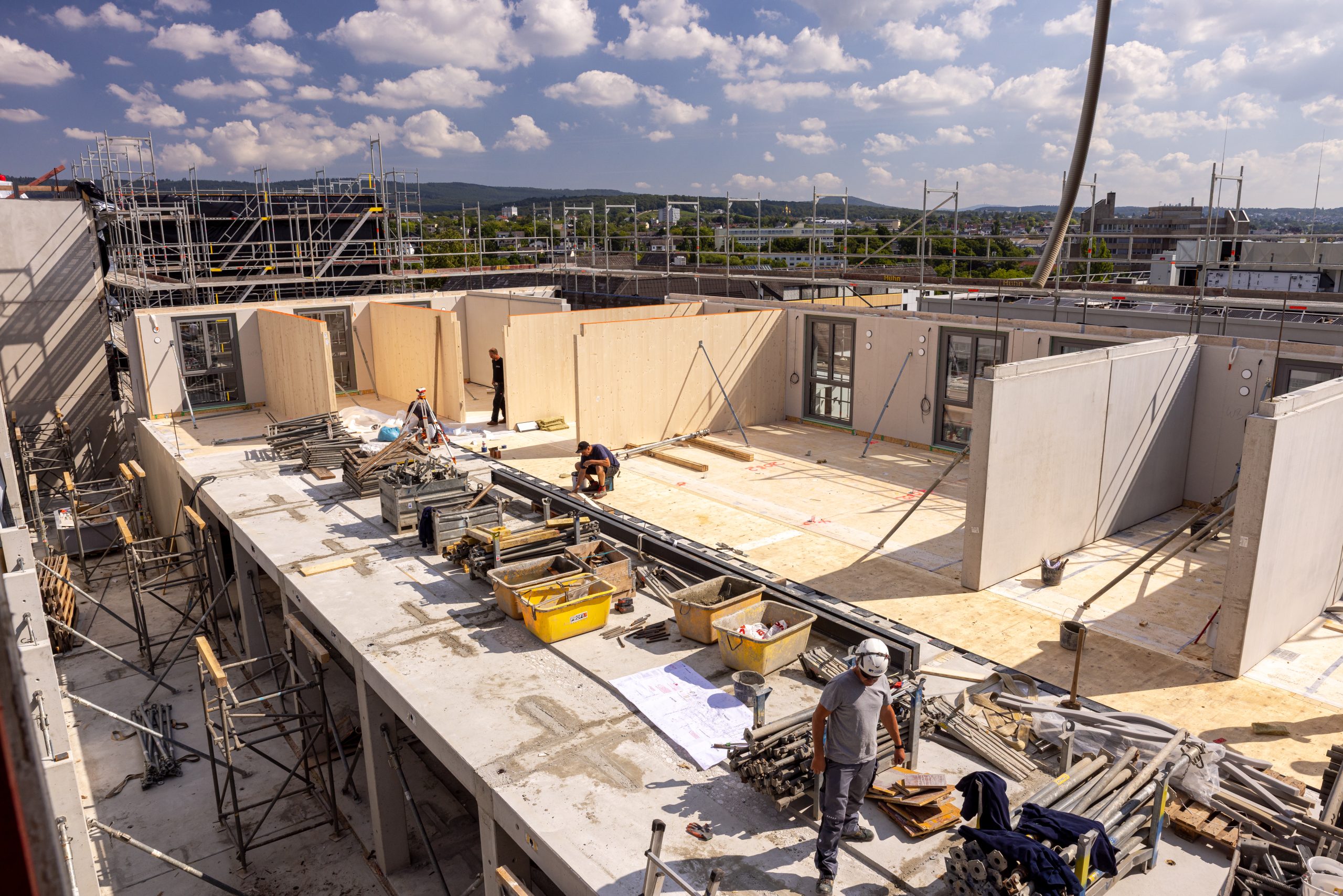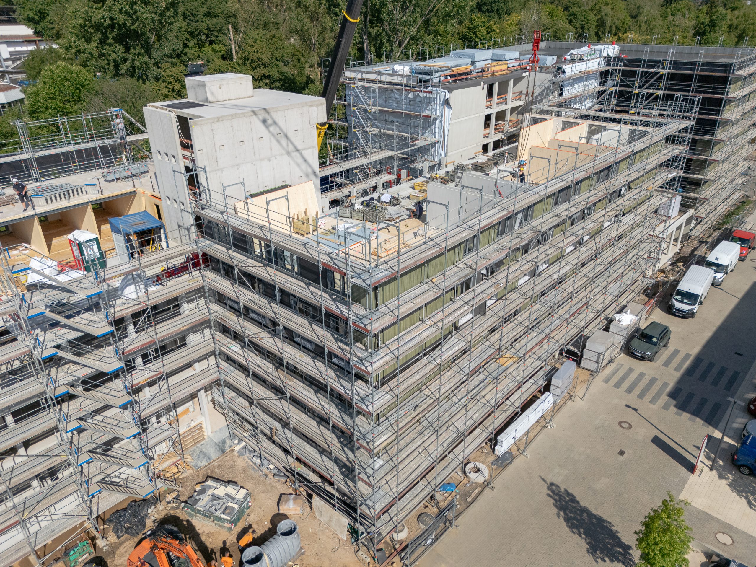 In Wiesbaden wurde das neue Studierendenwohnheim des MainSWerk Studierendenwerks Frankfurt erfolgreich fertiggestellt. Der Auftrag umfasste die Herstellung von Fertigteilen. Das neue Wohnheim bietet 435 Wohneinheiten und beherbergt eine Kindertagesstätte in zentraler Lage der hessischen Landeshauptstadt. Es besteht aus vier Baukörpern (A–D), die teilweise unterkellert sind. Während Erd- und Untergeschoss in konventioneller Betonbauweise errichtet wurden, entstanden die oberen Geschosse der 6- bis 7-geschossigen Gebäude in moderner Holzhybridbauweise. Wir waren mit der Herstellung und Montage der Verbindungsgänge zwischen den Baukörpern (Flaniermeilen), den daran anschließenden Gruppenräumen sowie mehreren Brandwänden beteiligt. Die Herausforderung der Arbeiten waren durch enge Platzverhältnisse und eine präzise Abstimmung mit dem Holzbau geprägt, da beide Gewerke zeitlich und räumlich eng verzahnt arbeiteten. Dank der reinen Fertigteilbauweise konnte die Bauzeit äußerst kurz gehalten werden.