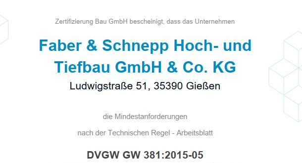 Wir sind ganz frisch nach DVGW-Arbeitsblatt GW 381 zertifiziert. Damit wird bestätigt, dass unser Unternehmen die anerkannten fachlichen, organisatorischen und qualitativen Anforderungen für Tiefbauarbeiten im Leitungsausbau – insbesondere für Gas-, Trinkwasser- und Stromleitungen – erfüllt.